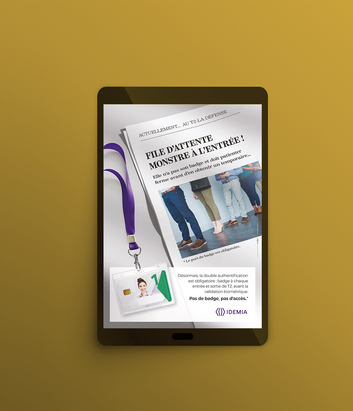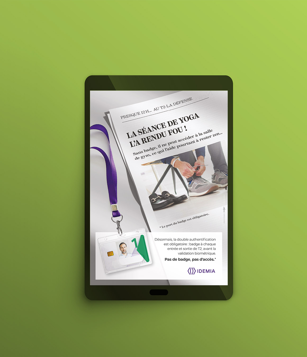 Le concept : l’agence a imaginé 5 affiches et 5 kakemonos dans l’esprit de “Une de quotidien”, mettant en scène des situations absurdes vécues par ceux qui oublient leur badge : file d’attente interminable, cantine inaccessible, séance de yoga manquée, imprimante en panne… jusqu’au concert du siècle raté.